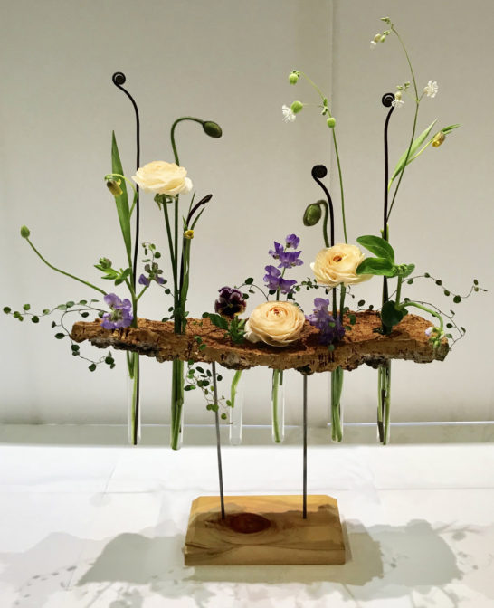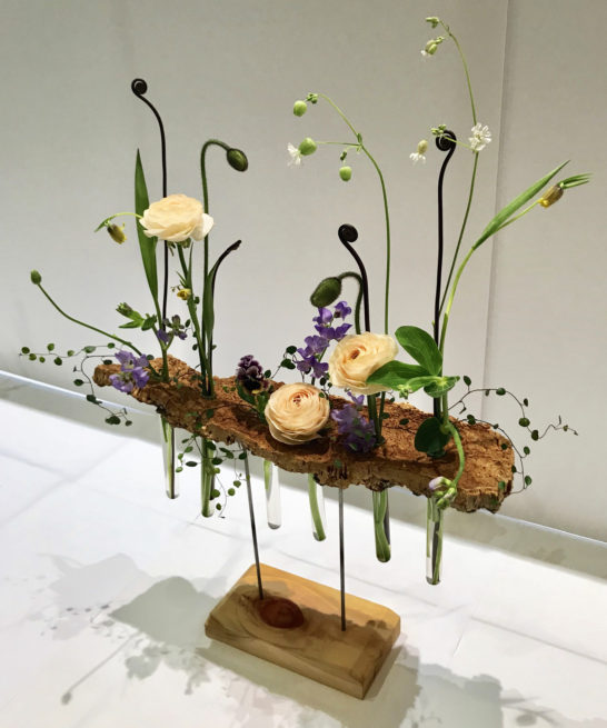 花のコンテストに出品した事はありますが今回は生け花です。とりあえず東急ハンズで見つけた木の皮を土台にし、試行錯誤の結果このような作品になりました。