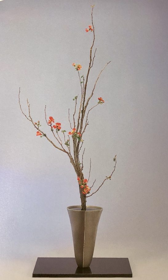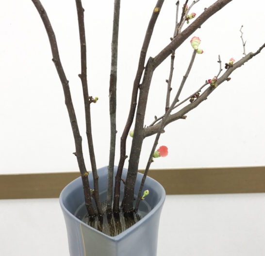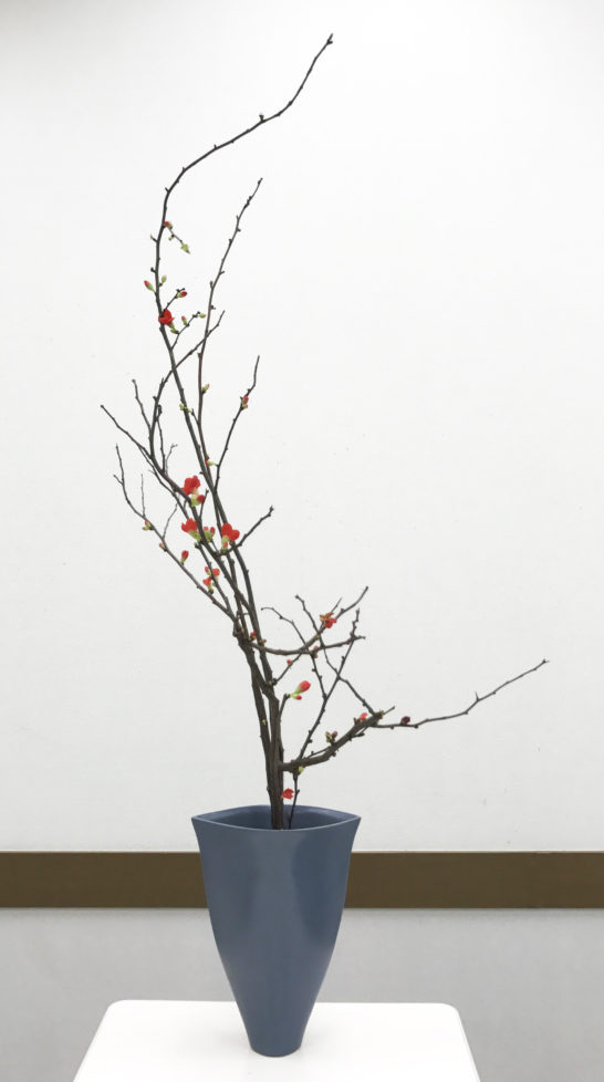 ボケはためやすく枝物を学ぶには最適な花材だそうです。最初にトゲを出来るだけ取り、真と副枝を決めて生けていきます