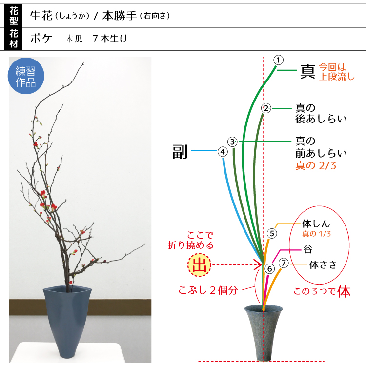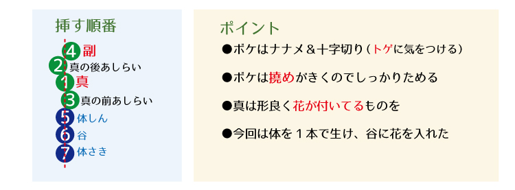 7本とありますが花材が太かったので「体しん・体さき」を1本でまとめて生けております