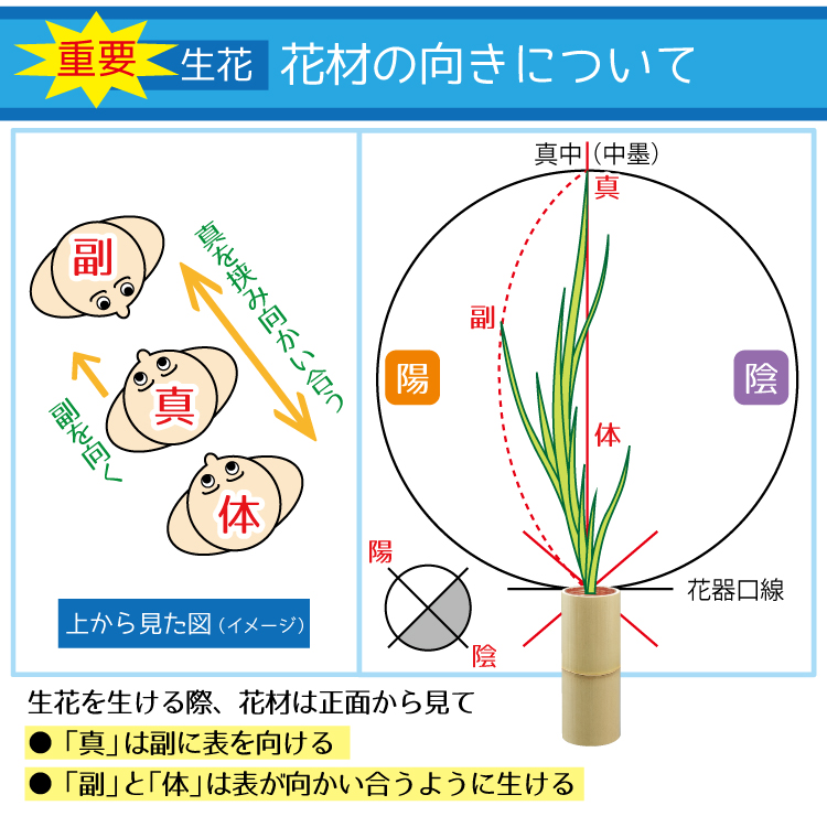 追記:「真は表を副へ向ける」と書きましたが、花材や茎の曲がりによってはその限りではないようです、先生に聞いてなるべく把握したいと思っています。
