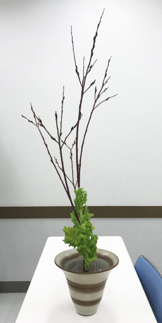 黒芽柳と菜の花の二種生けです。黒芽柳は1~2月によく使う花材だそうです。