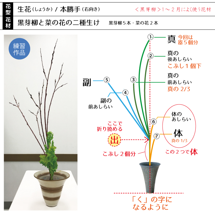 【生花】黒芽柳・菜の花<二種生け>