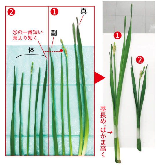 水仙は必ず同じ束の葉で生けるようにします。はかま(白根)をゆっくり外して葉組みを調え、もう一度はかまを付け直します。その時爪部分が正面にくるようにします。(葉の白い粉は生命力の証なので取らないようにする)